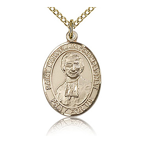 St Marcellin Champagnat die struck, hand-engraved medal is made of gold filled sterling silver. Inscription: SAINT MARCELLIN CHAMPAGNAT PRAY FOR US. 18-inch gold-plated sterling silver lite curb chain with lobster clasp. Dimensions: 3/4in x 1/2in. This item is the size of a penny. Made in USA.