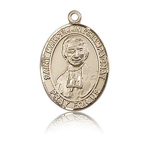 This ladies' 14k yellow gold oval St Marcellin Champagnat medal is die struck and hand-engraved. Inscription: SAINT MARCELLIN CHAMPAGNAT PRAY FOR US. Dimensions: 3/4in x 1/2in. This item is the size of a penny. Made in USA.