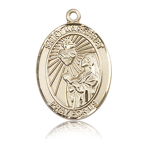 Die struck, hand-engraved St Margaret Mary Alacoque medal is made of solid 14k yellow gold. Inscription: SAINT MARGARET PRAY FOR US. Dimensions: 1in x 3/4in. This item is the size of a quarter. Made in USA.