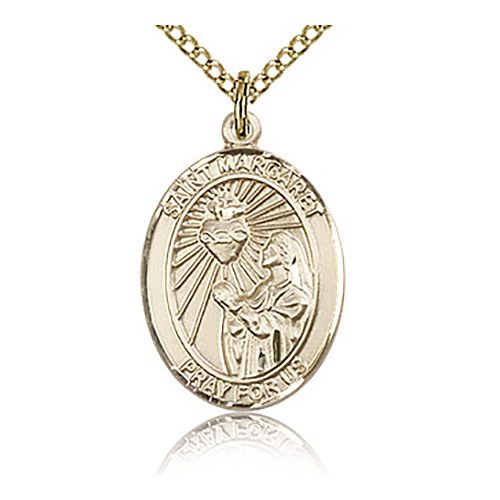 This ladies' gold filled sterling silver St Margaret Mary Alacoque medal is die struck and hand-engraved. Inscription: SAINT MARGARET PRAY FOR US. 18-inch gold-plated sterling silver lite curb chain with lobster clasp. Dimensions: 3/4in x 1/2in. This item is the size of a penny. Made in USA.