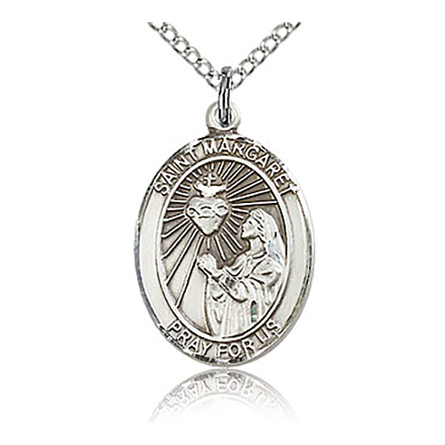 This ladies' oval St Margaret medal is made of solid sterling silver. Inscription: SAINT MARGARET PRAY FOR US. 18-inch sterling silver lite curb chain has a lobster clasp. Dimensions: 3/4in x 1/2in. This item is the size of a penny. Made in USA.