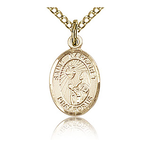 Die struck, hand-engraved St Margaret charm. Free 18-inch gold plated, sterling silver lite curb chain with lobster clasp. Plain back. Dimensions: 1/2in x 1/4in. This item is half the size of a quarter. Made in USA.