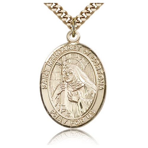 Gold filled sterling silver oval St Margaret of Cortona medal dangles from a 24-inch stainless steel, endless heavy curb chain with gold plating. Die struck, hand-engraved. Inscription: SAINT MARGARET of CORTONA PRAY FOR US. Dimensions: 1in x 3/4in. This item is the size of a quarter. Made in USA.