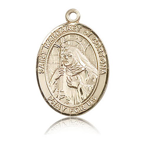 Die struck, hand-engraved St Margaret of Cortona medal is made of polished, solid 14k yellow gold. Inscription: SAINT MARGARET of CORTONA PRAY FOR US. Dimensions: 1in x 3/4in. This item is the size of a quarter. Made in USA.