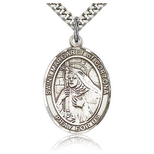 This men's St Margaret of Cortona medal is made of solid sterling silver. Inscription: SAINT MARGARET of CORTONA PRAY FOR US. 24-inch stainless steel, endless heavy curb chain with silver plating. Dimensions: 1in x 3/4in. This item is the size of a quarter. Die struck, hand-engraved. Made in USA.