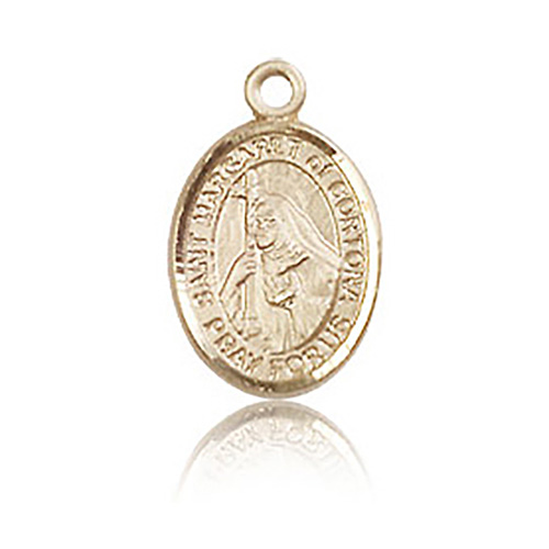 Die struck, hand-engraved medal is made of polished, solid 14kt yellow gold. Inscription: SAINT MARGARET of CORTONA PRAY FOR US. Dimensions: 1/2in x 1/4in. This item is half the size of a quarter. Made in USA.
