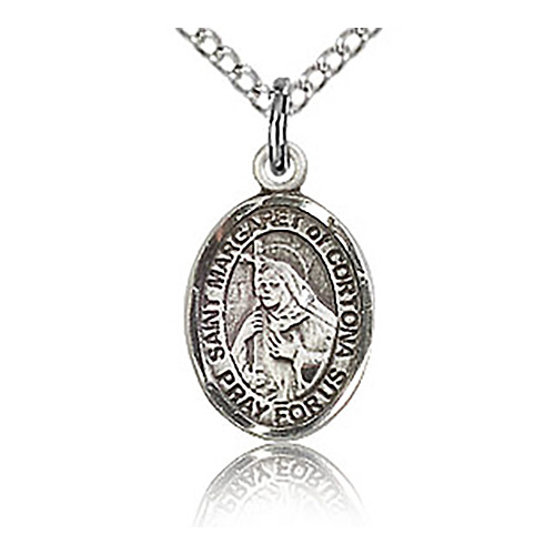 Die struck, hand-engraved St Margaret of Cortona charm. Free 18-inch sterling silver lite curb chain with lobster clasp. Plain back. Dimensions: 1/2in x 1/4in. This item is half the size of a quarter. Made in USA.