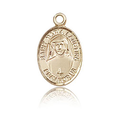This very small St Maria Faustina medal charm is made of polished, solid 14k yellow gold. Inscription: SAINT MARIA FAUSTINA PRAY FOR US. Dimensions: 1/2in x 1/4in. This item is half the size of a quarter. Die struck, hand-engraved. Made in USA.
