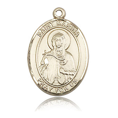 Die struck, hand-engraved St Marina medal is made of polished solid 14k yellow gold. Inscription: SAINT MARINA PRAY FOR US. Dimensions: 1in x 3/4in. This item is the size of a quarter. Made in USA.