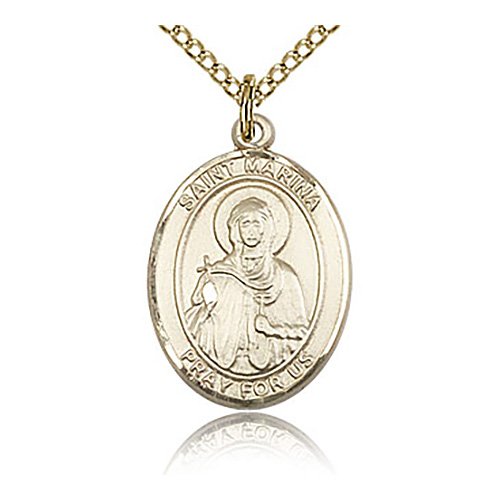 Gold filled oval St Marina medal dangles from a gold-plated sterling silver 18-inch curb chain with lobster clasp. Inscription: SAINT MARINA PRAY FOR US. Dimensions: 3/4in x 1/2in. This item is the size of a penny. Made in USA.