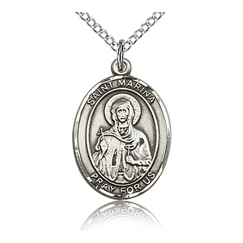 Sterling silver oval St Marina medal dangles from a 18-inch sterling silver lite curb chain with lobster clasp. Dimensions: 3/4in x 1/2in. Inscription: SAINT MARINA PRAY FOR US. Die struck, hand-engraved. This item is the size of a penny. Made in USA.