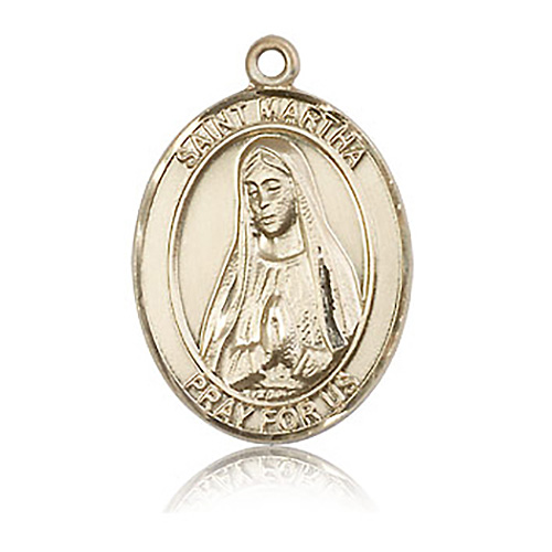 Die struck, hand-engraved medal is made of polished, solid 14kt yellow gold. Inscription: SAINT MARTHA PRAY FOR US. Dimensions: 1in x 3/4in. This item is the size of a quarter. Made in USA.