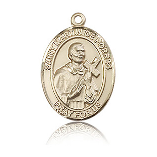 Die struck, hand-engraved St Martin de Porres medal is made of polished, solid 14k yellow gold. Inscription: SAINT MARTIN DE PORRES PRAY FOR US. Dimensions: 3/4in x 1/2in. This item is the size of a penny. Made in USA.