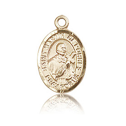 This very small oval St Martin de Porres medal is made of polished, solid 14k yellow gold. Inscription: SAINT MARTIN DE PORRES PRAY FOR US. Dimensions: 1/2in x 1/4in. This item is half the size of a quarter. Made in USA.