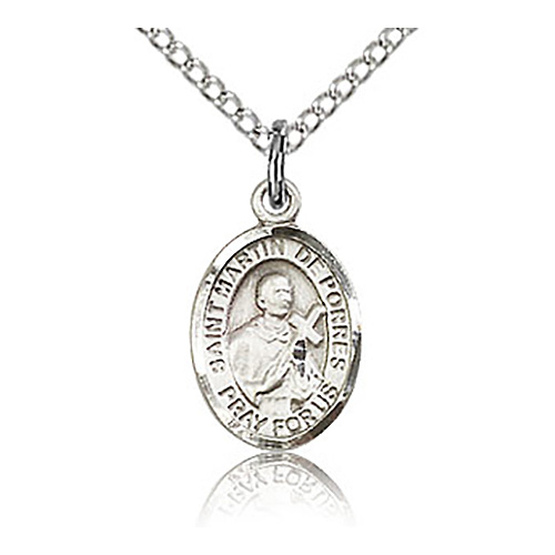 This tiny oval St Martin de Porres charm is made of sterling silver. 18-inch sterling silver lite curb chain with lobster clasp. Plain back. Dimensions: 1/2in x 1/4in. This item is half the size of a quarter. Made in USA.