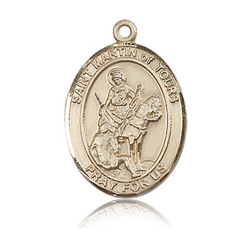 Die struck, hand-engraved medal is made of polished, solid 14kt yellow gold. Inscription: SAINT MARTIN OF TOURS PRAY FOR US. Dimensions: 1in x 3/4in. This item is the size of a quarter. Made in USA.