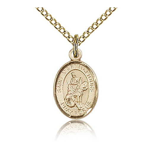 Die struck, hand-engraved St Martin of Tours charm is made of gold filled sterling silver. 18-inch gold plated, sterling silver lite curb chain with lobster clasp. Plain back. Dimensions: 1/2in x 1/4in. This item is half the size of a quarter. Made in USA.
