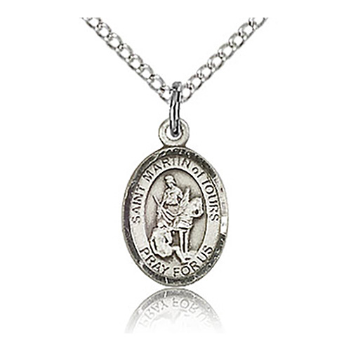 This small oval St Martin of Tours charm dangles from a sterling silver 18in lite curb chain with lobster clasp. Dimensions: 1/2in x 1/4in. Plain back. This item is half the size of a quarter. Die struck, hand-engraved. Made in USA.
