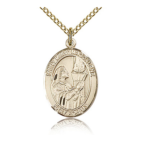 St Mary Magdalene medal is made of gold filled sterling silver. Inscription: SAINT MARY MAGDALENE PRAY FOR US. 18-inch gold-plated sterling silver lite curb chain has a lobster clasp. Dimensions: 3/4in x 1/2in. This item is the size of a penny. Made in USA.