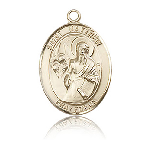 Die struck, hand-engraved medal is made of polished, solid 14kt yellow gold. Inscription: SAINT MATTHEW PRAY FOR US. Dimensions: 3/4in x 1/2in. This item is the size of a penny. Made in USA.