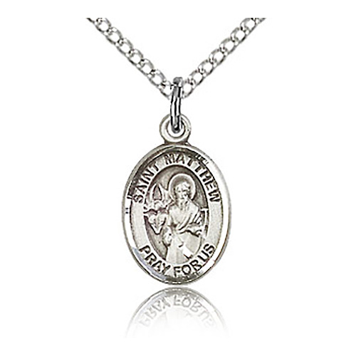 This very small sterling silver St Matthew charm dangles from an 18-inch sterling silver lite curb chain with lobster clasp. Plain back. Dimensions: 1/2in x 1/4in. This item is half the size of a quarter. Die struck, hand-engraved. Made in USA.