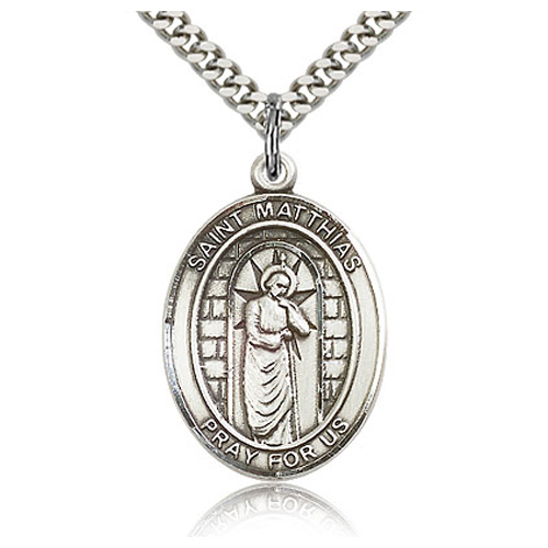 This oval St. Matthias medal is made of antiqued sterling silver. Die struck, hand-engraved. Inscription: SAINT MATTHIAS PRAY FOR US. 24-inch stainless steel, endless heavy curb chain with silver plating. Dimensions: 1in x 3/4in. This item is the size of a quarter. Made in USA.