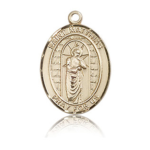 Die struck, hand-engraved medal is made of polished, solid 14kt yellow gold. Inscription: SAINT MATTHIAS PRAY FOR US. Dimensions: 3/4in x 1/2in. This item is the size of a penny. Made in USA.