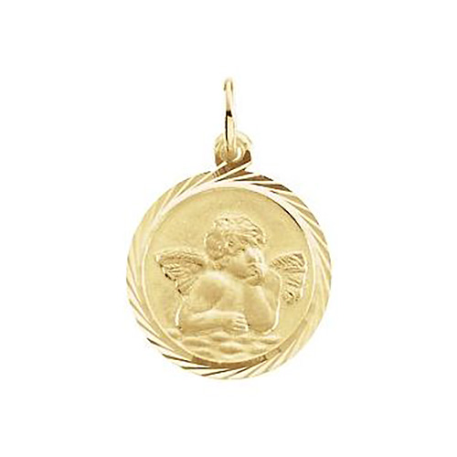 This small solid 14k yellow gold round Raphael angel charm has fancy borders. Dimensions: 14mm x 14mm. This charm is smaller than a dime. Pendant weighs 1.07 grams. Please note: weight is approximate, actual weight may vary. Made in USA.