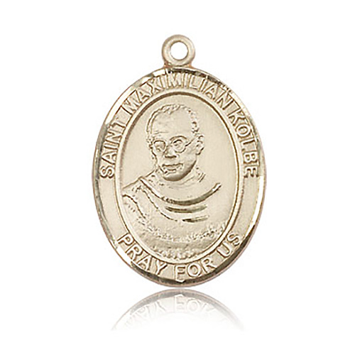 Die struck, hand-engraved medal is made of polished, solid 14kt yellow gold. Inscription: SAINT MAXIMILIAN KOLBE PRAY FOR US. Dimensions: 1in x 3/4in. This item is the size of a quarter. Made in USA.