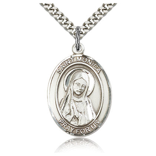 Sterling silver St. Monica medal is die struck and hand-engraved. Inscription: SAINT MONICA PRAY FOR US. 24-inch stainless steel, endless heavy curb chain with silver plating. Medal size: 1in x 3/4in. This item is the size of a quarter. Made in USA.