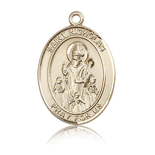 Die struck, hand-engraved medal is made of polished, solid 14kt yellow gold. Inscription: SAINT NICHOLAS PRAY FOR US. Dimensions: 1in x 3/4in. This item is the size of a quarter. Made in USA.