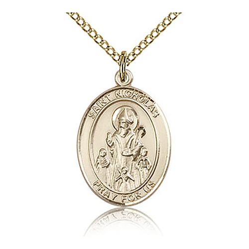 This oval St. Nicholas medal is made of gold filled sterling silver. Inscription: SAINT NICHOLAS PRAY FOR US. 18-inch gold-plated sterling silver lite curb chain with lobster clasp. Dimensions: 3/4in x 1/2in. This item is the size of a penny. Die struck, hand-engraved medal. Made in USA.