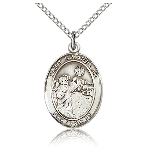 Die struck, hand-engraved medal. Inscription: SAINT NIMATULLAH PRAY FOR US. Free 18-inch sterling silver lite curb chain with lobster clasp. Dimensions: 3/4in x 1/2in. This item is the size of a penny. Made in USA.
