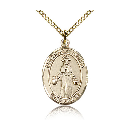Die struck, hand-engraved oval St Nino de Atocha medal is made of gold filled sterling silver. Inscription: SAINT NINO de ATOCHA PRAY FOR US. 18-inch sterling silver lite curb chain with lobster clasp. Dimensions: 3/4in x 1/2in. This item is the size of a penny. Made in USA.