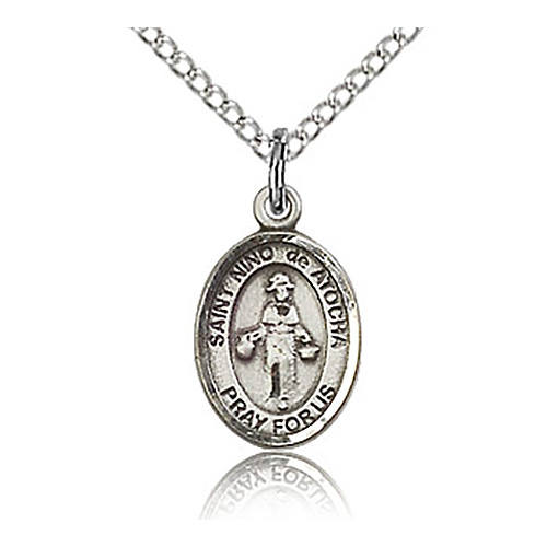 Die struck, hand-engraved St Nino de Atocha charm. Free 18-inch sterling silver lite curb chain with lobster clasp. Plain back. Dimensions: 1/2in x 1/4in. This item is half the size of a quarter. Made in USA.