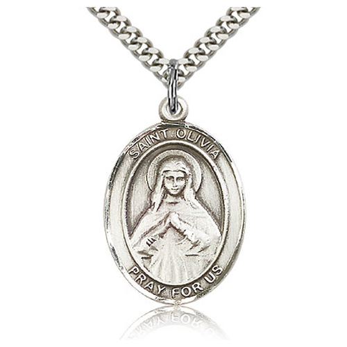 This men's St Olivia medal is made of solid sterling silver. Inscription: SAINT OLIVIA PRAY FOR US. 24-inch stainless steel, endless heavy curb chain with silver plating. Dimensions: 1in x 3/4in. This item is the size of a quarter. Die struck, hand-engraved medal. Made in USA.