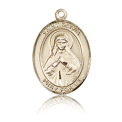 This oval St Olivia medal is made of polished, solid 14kt yellow gold. Inscription: SAINT OLIVIA PRAY FOR US. Dimensions: 3/4in x 1/2in. This item is the size of a penny. Die struck, hand-engraved medal is made in USA.