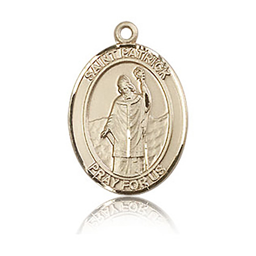 Die struck, hand-engraved St. Patrick medal is made of polished, solid 14k yellow gold. Inscription: SAINT PATRICK PRAY FOR US. Dimensions: 3/4in x 1/2in. This item is the size of a penny. Made in USA.