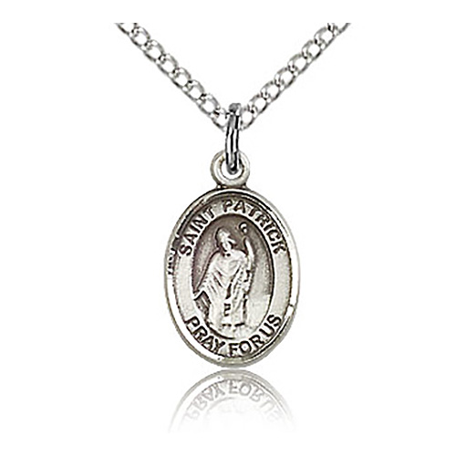 This very small sterling silver St Patrick charm dangles from a sterling silver 18in lite curb chain with lobster clasp. Plain back. Dimensions: 1/2in x 1/4in. This item is half the size of a quarter. Made in USA.