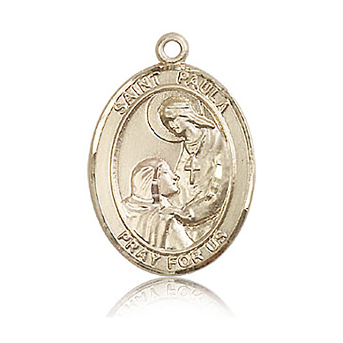 St Paula medal is made of polished, solid 14k yellow gold. Inscription: SAINT PAULA PRAY FOR US. Dimensions: 1in x 3/4in. This item is the size of a quarter. Made in USA.