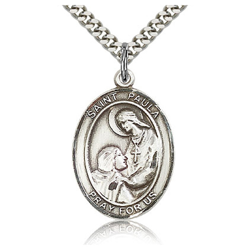 This oval St Paula medal is made of antiqued sterling silver. Die struck, hand-engraved. Inscription: SAINT PAULA PRAY FOR US. 24-inch stainless steel, endless heavy curb chain with silver plating. Dimensions: 1in x 3/4in. This item is the size of a quarter. Made in USA.