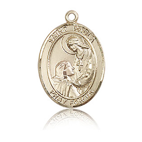 Die struck, hand-engraved St. Paula medal is made of polished, solid 14kt yellow gold. Inscription: SAINT PAULA PRAY FOR US. Dimensions: 3/4in x 1/2in. This item is the size of a penny. Made in USA.
