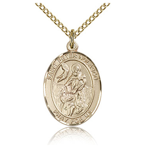 Gold-filled sterling silver oval St Peter Nolasco medal dangles from a gold-plated sterling silver 18in curb chain with lobster clasp. Inscription: SAINT PETER NOLASCO PRAY FOR US. Dimensions: 3/4in x 1/2in. This item is the size of a penny. Made in USA.