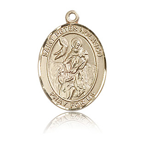 This ladies' 14k yellow gold oval St Peter Nolasco medal is die struck and hand-engraved. Inscription: SAINT PETER NOLASCO PRAY FOR US. Dimensions: 3/4in x 1/2in. This item is the size of a penny. Made in USA.