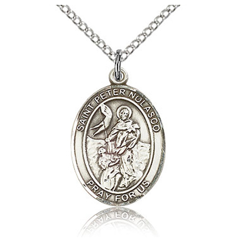 Die struck, hand-engraved medal. Inscription: SAINT PETER NOLASCO PRAY FOR US. Free 18-inch sterling silver lite curb chain with lobster clasp. Dimensions: 3/4in x 1/2in. This item is the size of a penny. Made in USA.