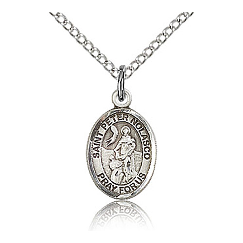 Die struck, hand-engraved St Peter Nolasco charm. Free 18-inch sterling silver lite curb chain with lobster clasp. Plain back. Dimensions: 1/2in x 1/4in. This item is half the size of a quarter. Made in USA.