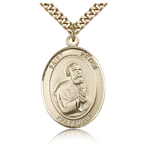 This men's St Peter medal is made of gold filled sterling silver. Inscription: SAINT PETER PRAY FOR US. 24-inch stainless steel, endless heavy curb chain with gold plating. Dimensions: 1in x 3/4in. This item is the size of a quarter. Die struck, hand-engraved medal. Made in USA.