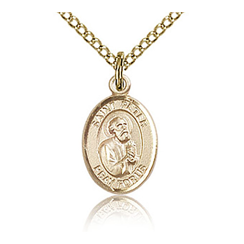 Die struck, hand-engraved St Peter charm is made of gold filled sterling silver. Gold plated, sterling silver 18-inch curb chain has a lobster clasp. Plain back. Dimensions: 1/2in x 1/4in. This item is half the size of a quarter. Made in USA.