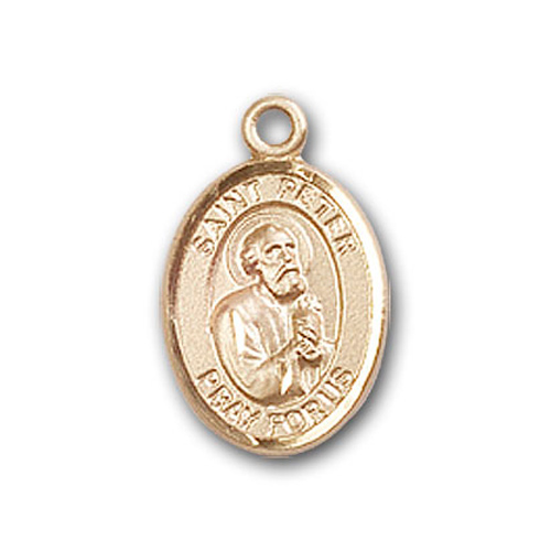 This very small oval St Peter charm is made of polished 14k yellow gold. Inscription: SAINT PETER PRAY FOR US. Dimensions: 1/2in x 1/4in. This item is half the size of a quarter. Die struck, hand-engraved. Made in USA.