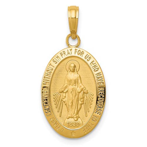 Solid 14k yellow gold oval miraculous medal has a polished and satin finish. This die struck medal is 3/4 inches in height, about the size of a penny. Inscription reads O MARY CONCEIVED WITHOUT SIN PRAY FOR US WHO HAVE RECOURSE TO THEE. Back of medal features an M, surmounted by a cross, with 2 hearts and 12 stars. Approximate weight: 1.9 grams. Fits up to a 3mm wide chain. Made in Peru. Ships from USA.